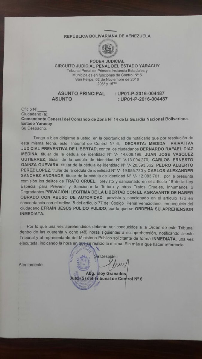 Por otra parte se conocio extra oficialmente a través de un twitter publicador por el periodista Alberto Rodriguez que el abogado Eloy Granados, juez (S) de control N° 6 dictó medida privativa de libertad a los funsionarios que actuaron en dicho procedimiento.
